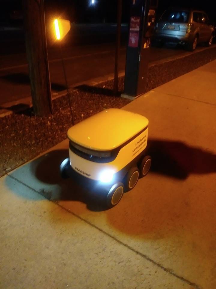 These food delivery bots are scampering around campus at NAU. Sierra says it's interesting to see the students interacting with them. Rushing over to help them when they get stuck. If one stops and seems confused a student would say "You OK little dude?" Have to watch for them or you could trip or get run down. She says at the staging line for returns it's a no human allowed area as they get rambunctous.